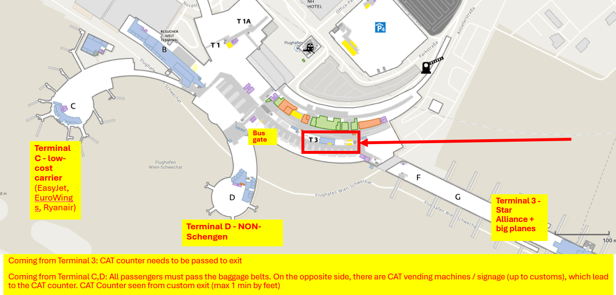 All airlines use the same arrival hall in Terminal 3 of Vienna Airport. Please look for the EULAR branded CAT counter where you will find two special desks to have your congress badge printed.